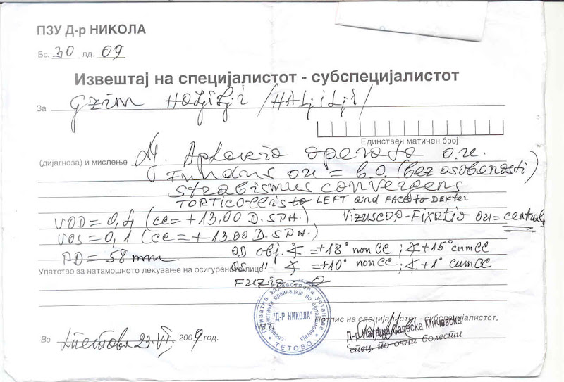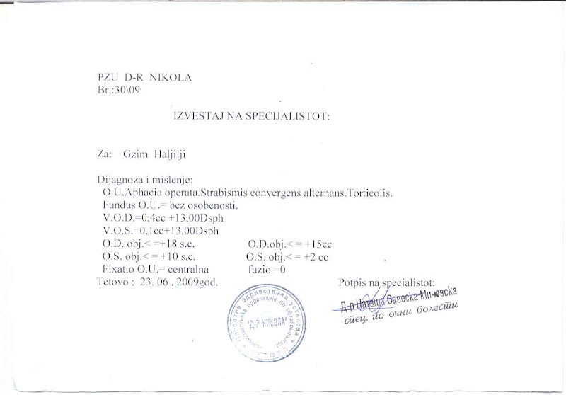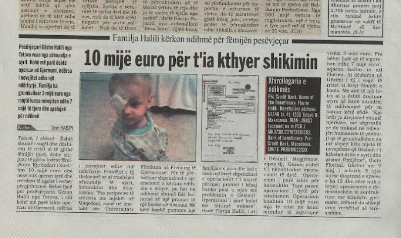 Operaciooni i parë ishte për kataraktin.Tani pason operacioni i dytë për strabizmin.Operacioni kushton 10 mijë euro nga të cilat prindërit e tij kanë mundur të sigurojnë vtëm 3 mijë euro.Pra bëhet fjalë që të sigurohen edhe 7 mijë euro.